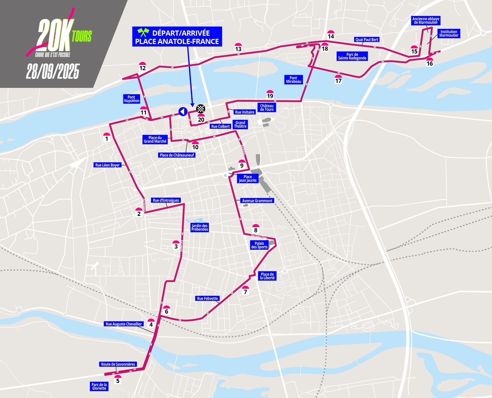 Épreuve reine et historique, les 20 km de Tours font peau neuve avec un tracé inédit, conçu pour allier plaisir des yeux et records personnels. Le départ sera donné sur le quai Paul Bert pour une échappée belle vers Rochecorbon, avant un retour rythmé vers l’effervescence du centre-ville. Prêt à relever le défi sur ce nouveau terrain de jeu ?